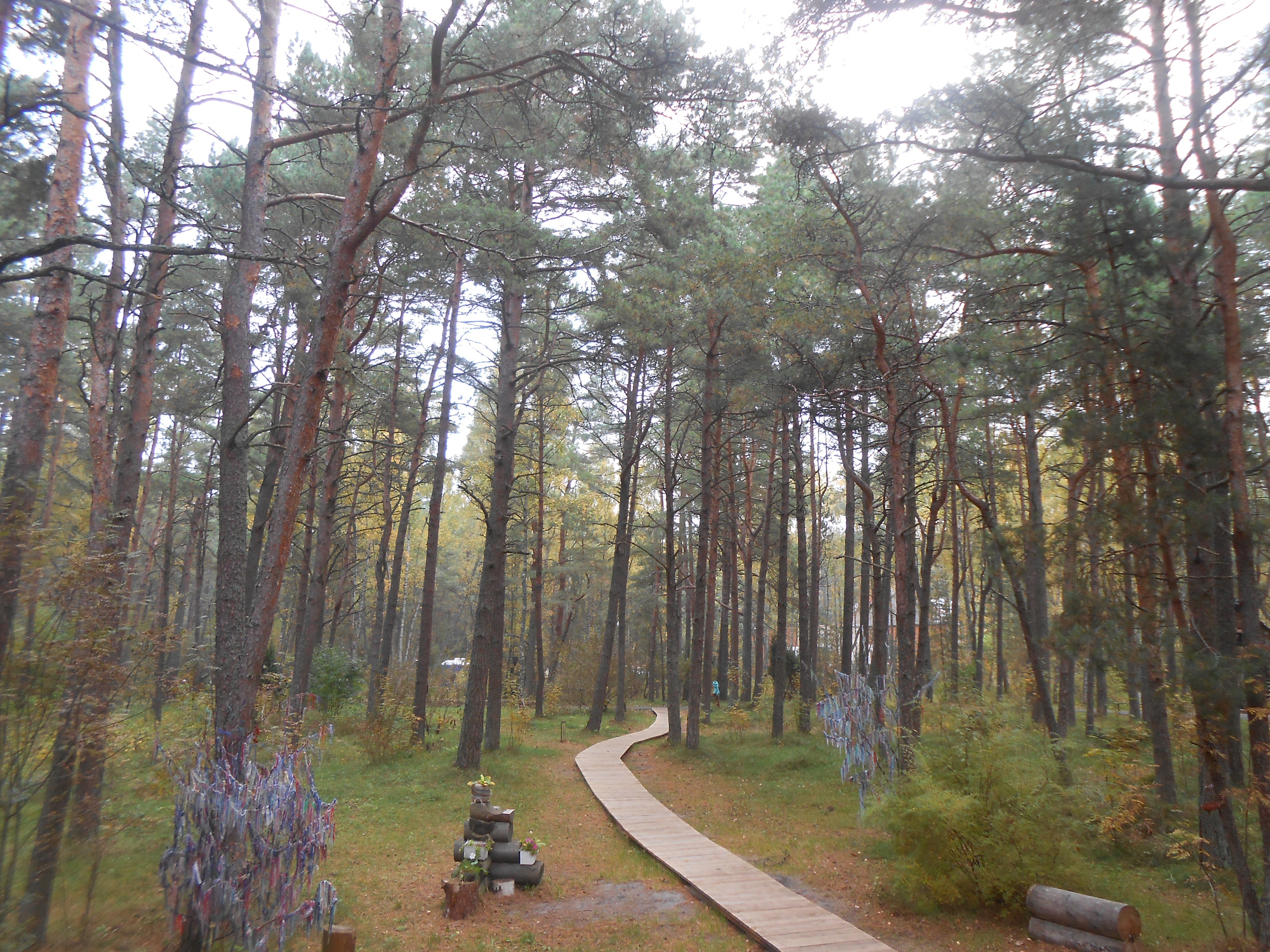 Лес на Куршской косе, тропинка ведущая вглубь и деревья. на которых висят ленточки с желаниями