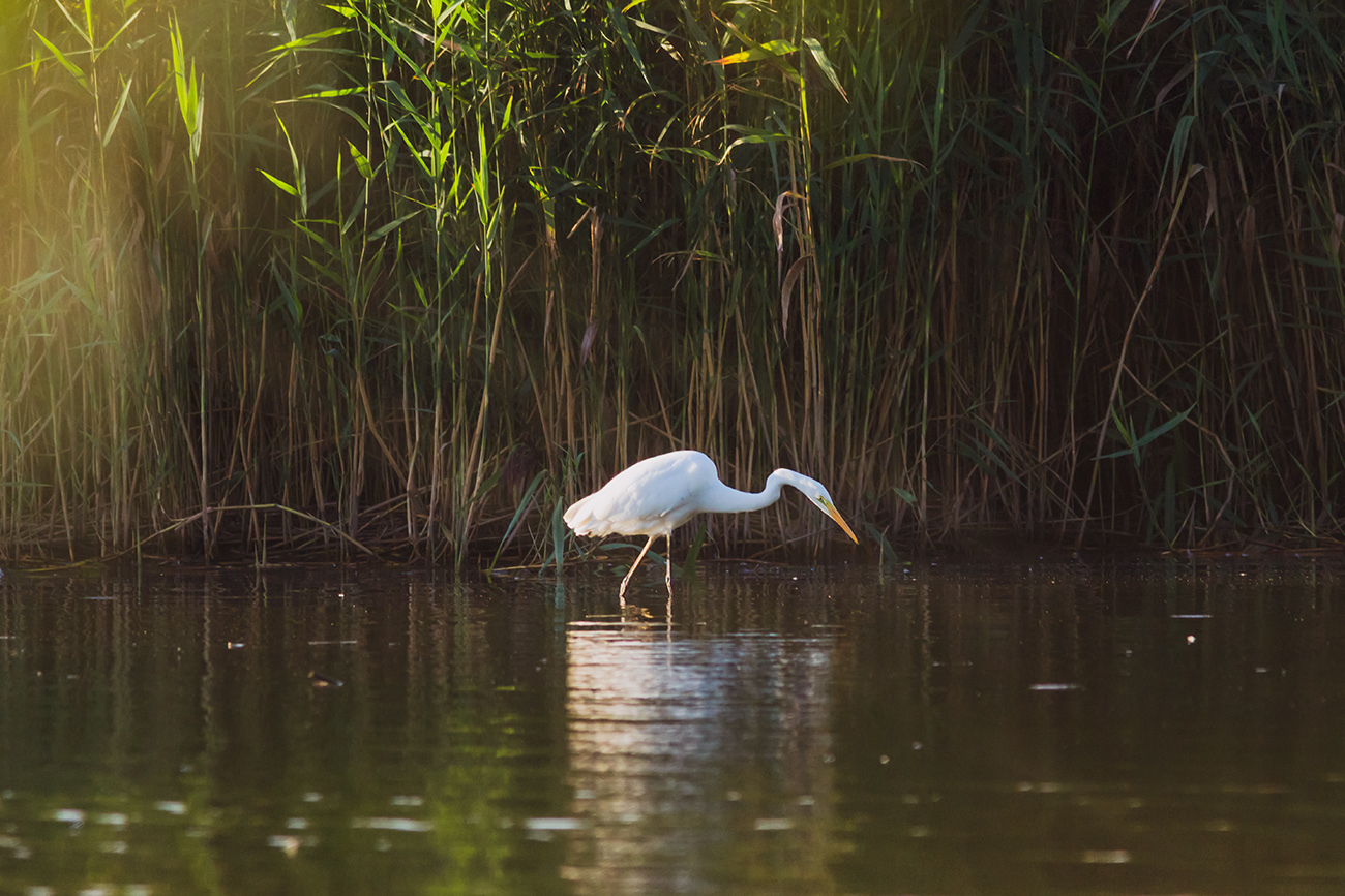 Большая белая цапля на рыбалке.