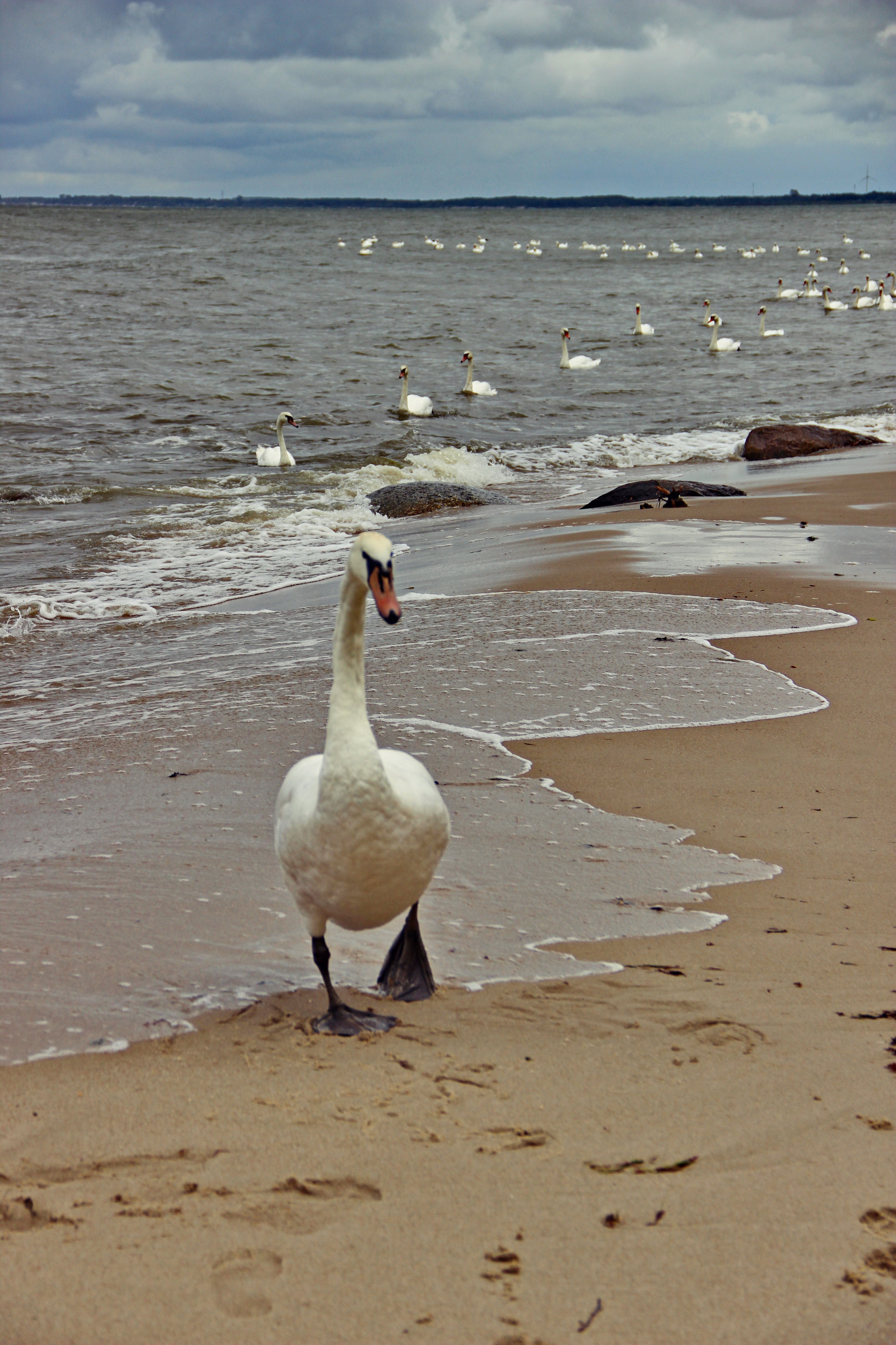По дороге вдоль берега из посёлка Куликово в Пионерский мы встретили лебединую стаю. Август 2016 года