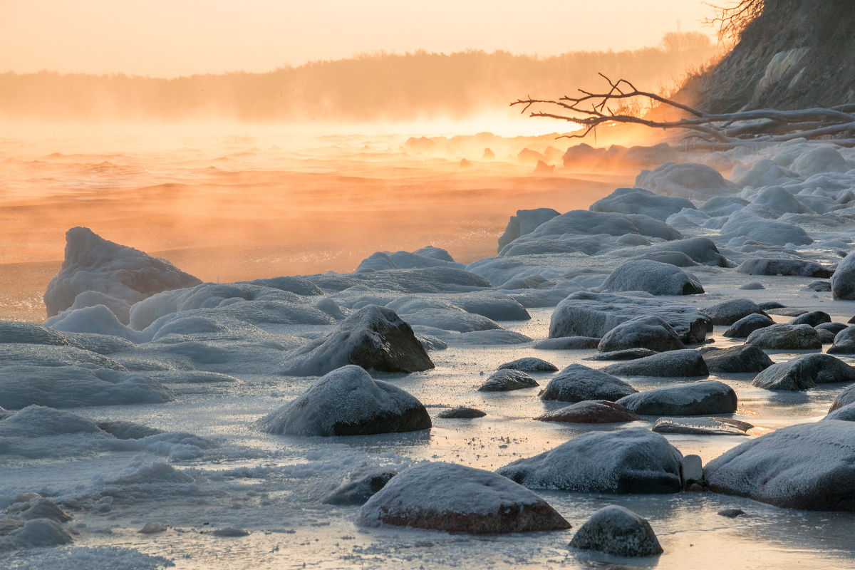 Морозный рассвет на побережье Балтийского моря. Температура воды +6°, температура воздуха -17° - море парит.